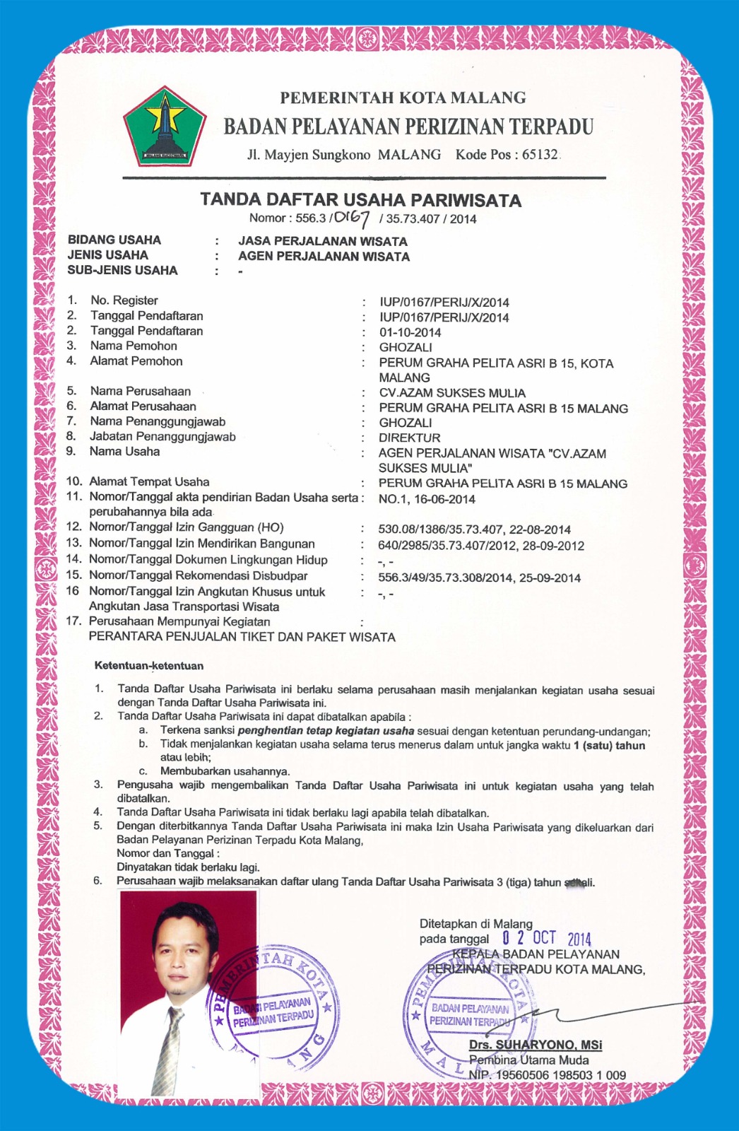 Legalitas usaha Percayakan kebutuhan event dan perjalanan Anda kepada Azam Go Holiday sekarang juga! Karena kami dilengkapi dengan legalitas usaha sesuai dengan spesifikasi kebutuhan Anda.